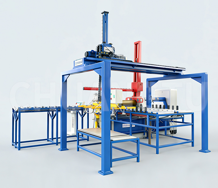 2、自动取料装置采带有缓冲的大吸力真空吸盘,结构合理,故障率低。吸盘导向柱带有弹簧缓冲,气管连接在金属导向柱上,结构稳定不易脱落。可调式吸盘支架可以按照卷制工件长宽调整吸盘位置,保证取料的稳定高效。提升装置带有稳定导向杆保证提升和行走时的快速稳定,选择优质大功率气缸或伺服电机,升降速度快,运行稳定无抖动。